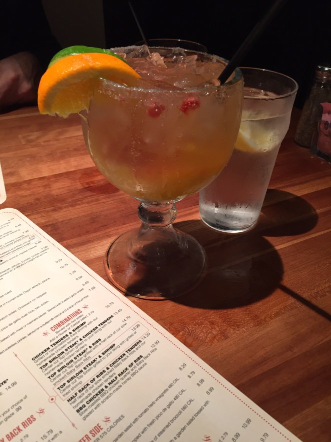 A few days ago, my husband and I met up for lunch at Cheddar’s Scratch Kitchen. At the recommendation of our server, I decided to try the Maui Margarita, which is a mixture of a regular margarita and a mango margarita, with a “cactus juice” floater. The combination of these different colors/flavors gave the drink an interesting appearance, as each flavor was initially separated from the others. The Maui Margarita was pretty delish. I also had the crispy chicken salad, which was also pretty good, but had a lot of lettuce. My husband had the club sandwich with a loaded baked potato, which he seemed to enjoy.
